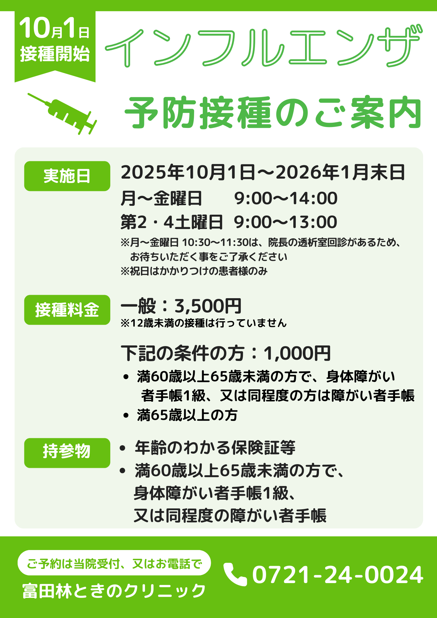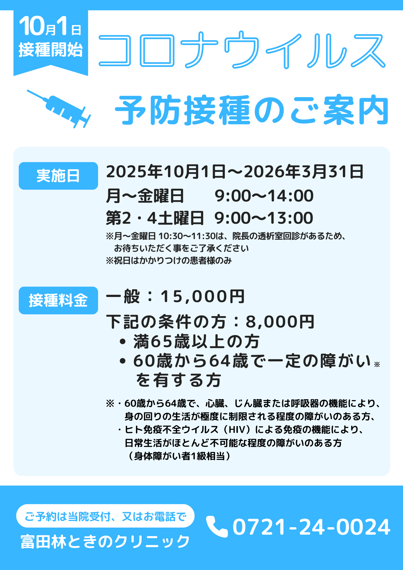 当院では、2025年10月1日よりインフルエンザおよびコロナウイルスの予防接種を実施いたします。
